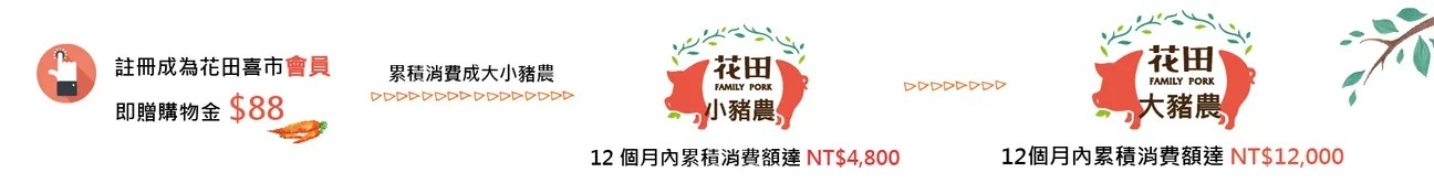 小豬農消費$50元贈1點,大豬農消費$20元贈1點(1點折抵$1元)